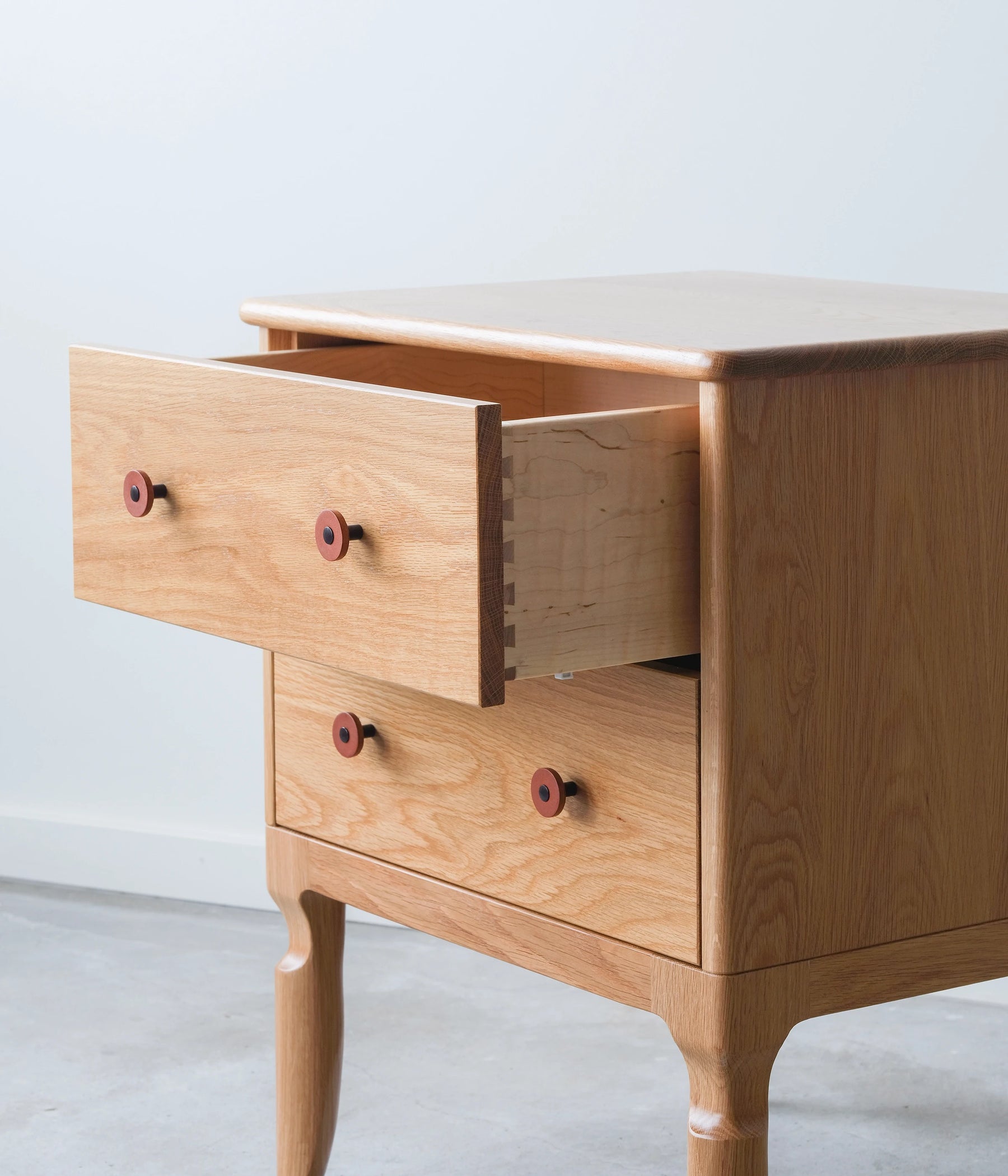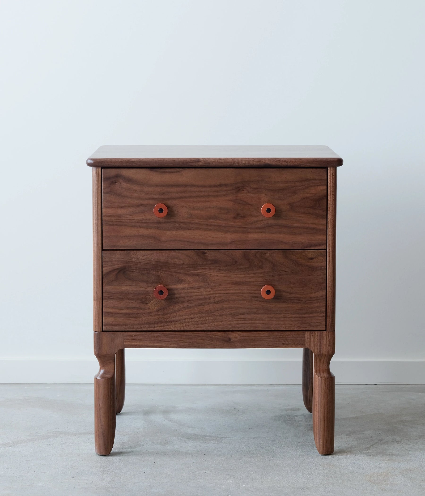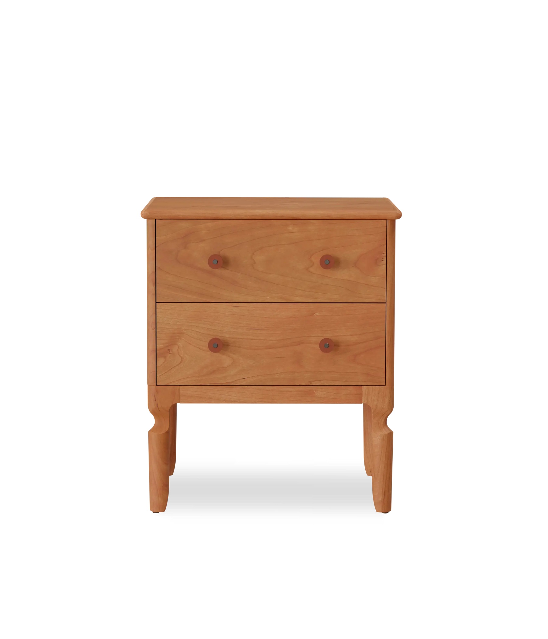 Our Condesa Nightstand is an elegant sidekick to any bed. It's our modern twist to the classic cabriole leg. The Condesa leather pulls are made in house and the two dovetail drawers utilize under mount, soft close slides.