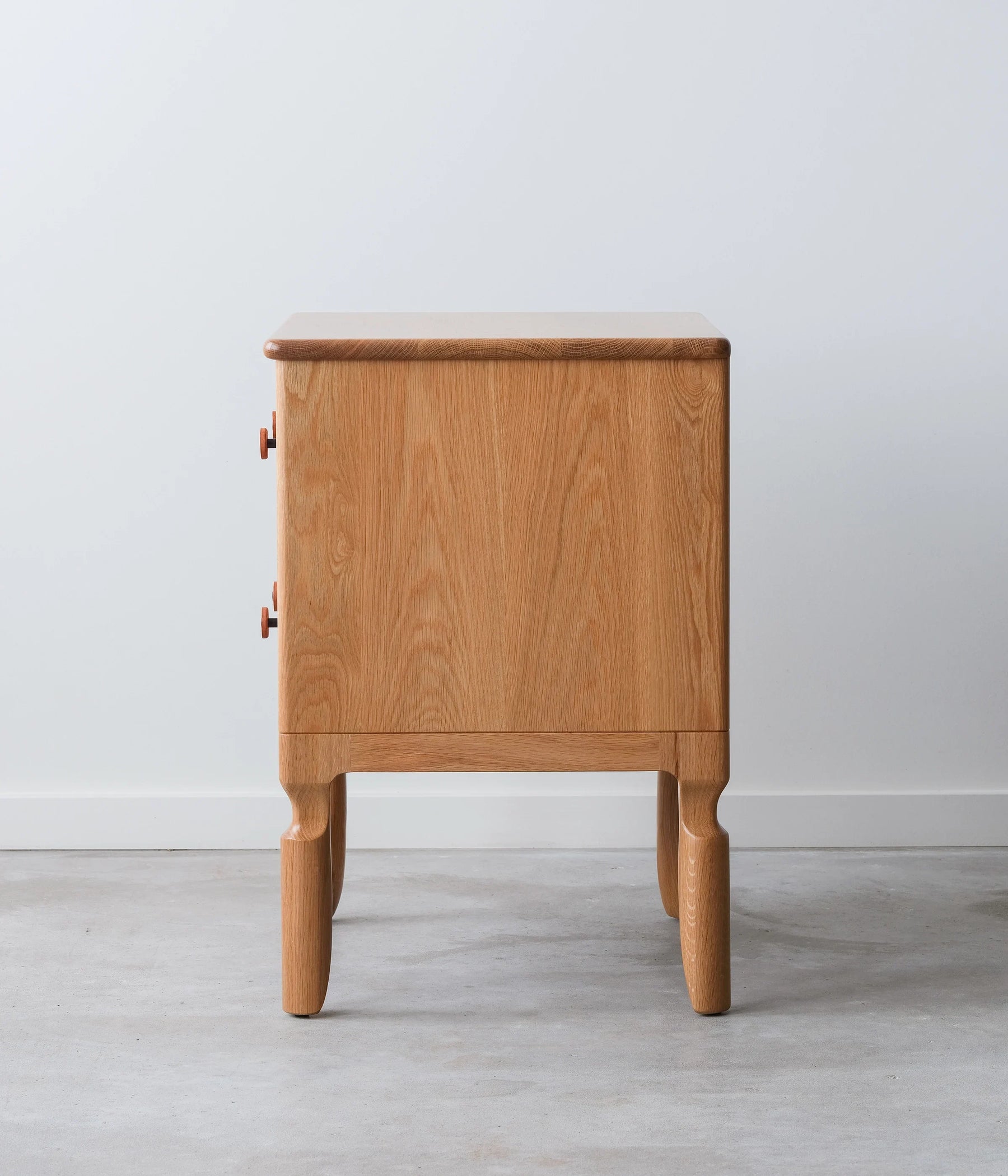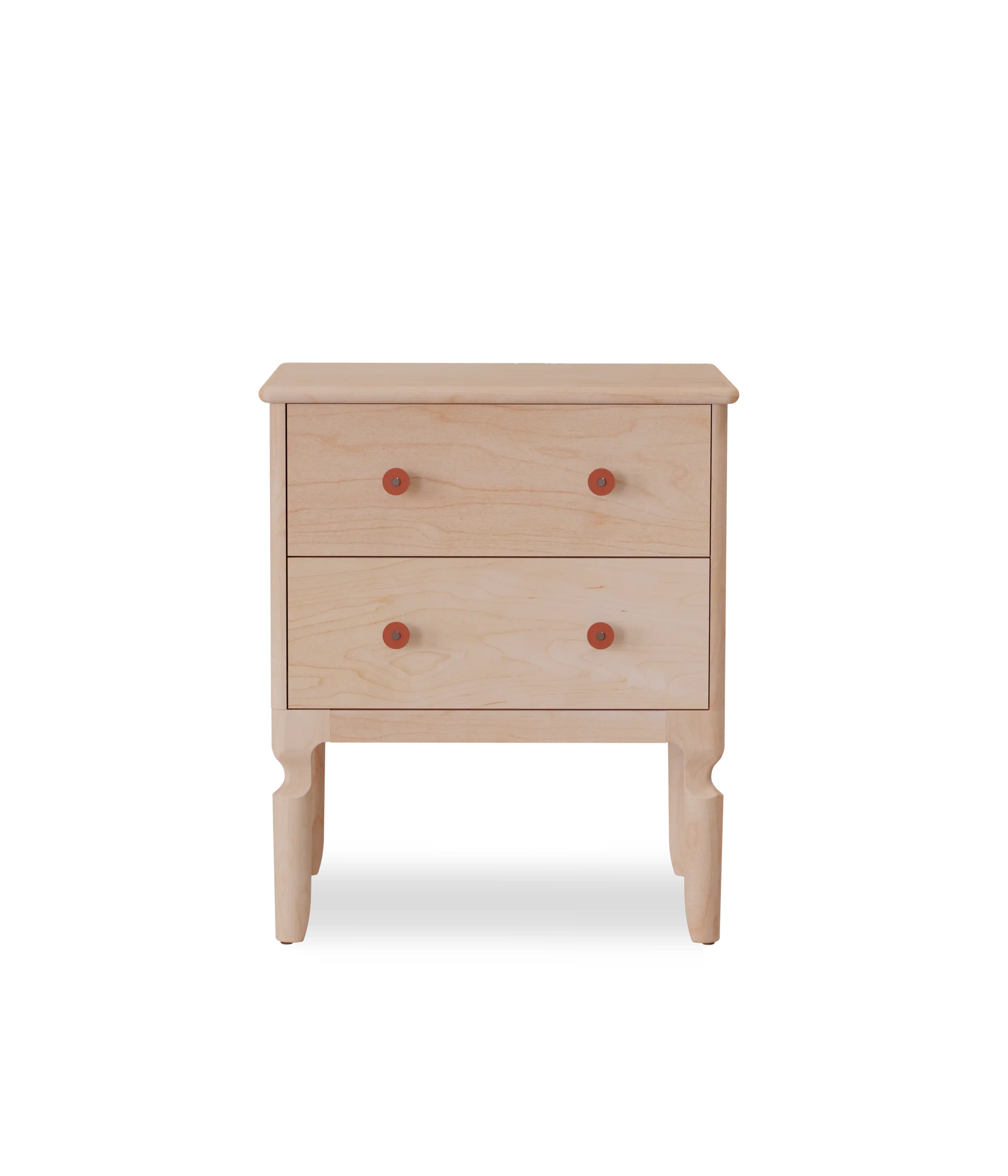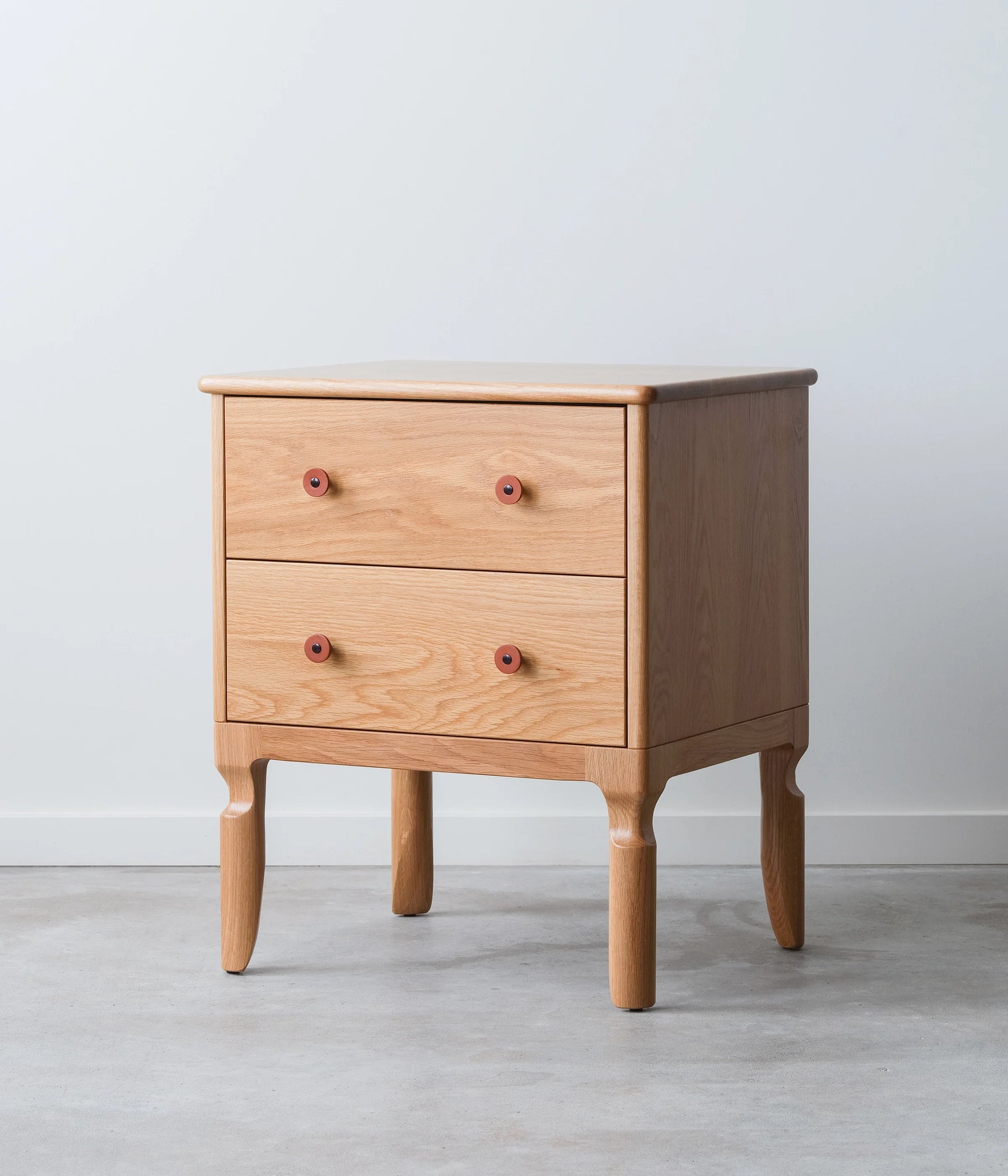 Our Condesa Nightstand is an elegant sidekick to any bed. It's our modern twist to the classic cabriole leg. The Condesa leather pulls are made in house and the two dovetail drawers utilize under mount, soft close slides.