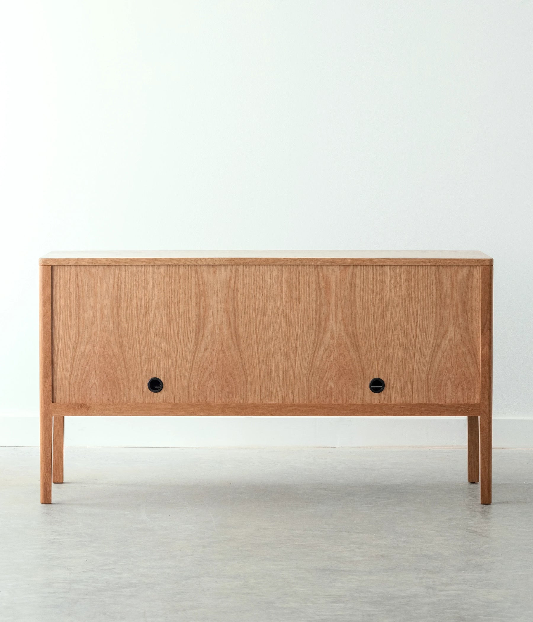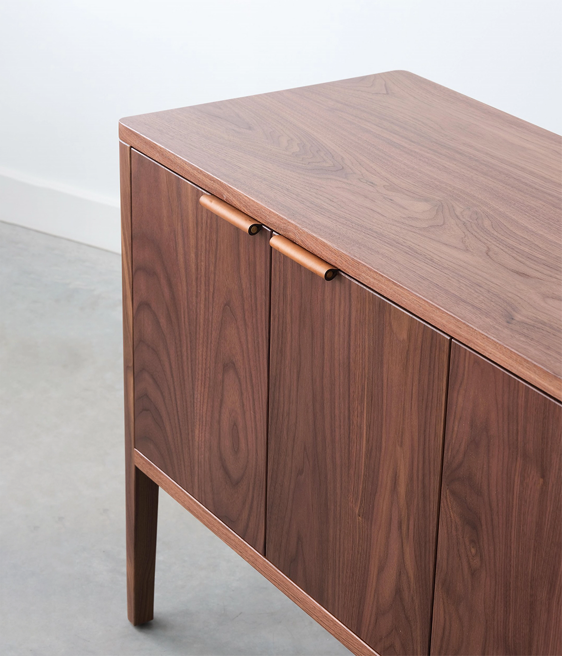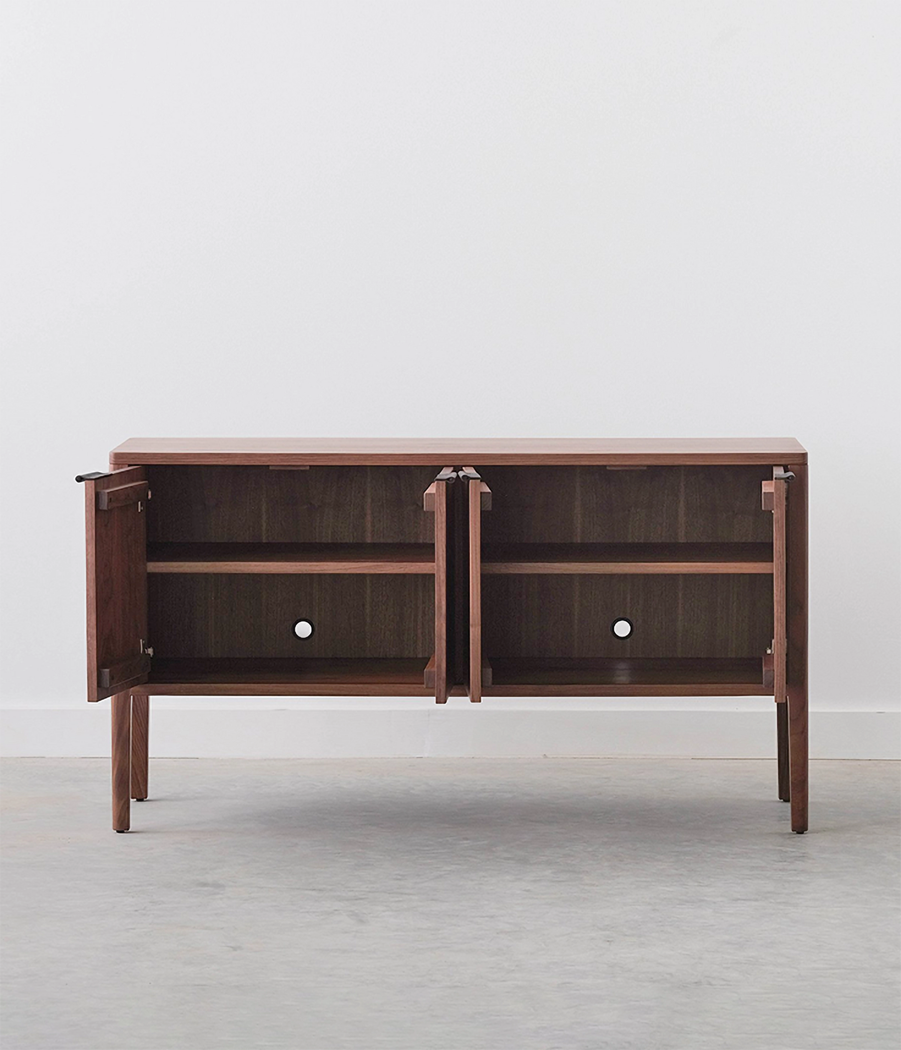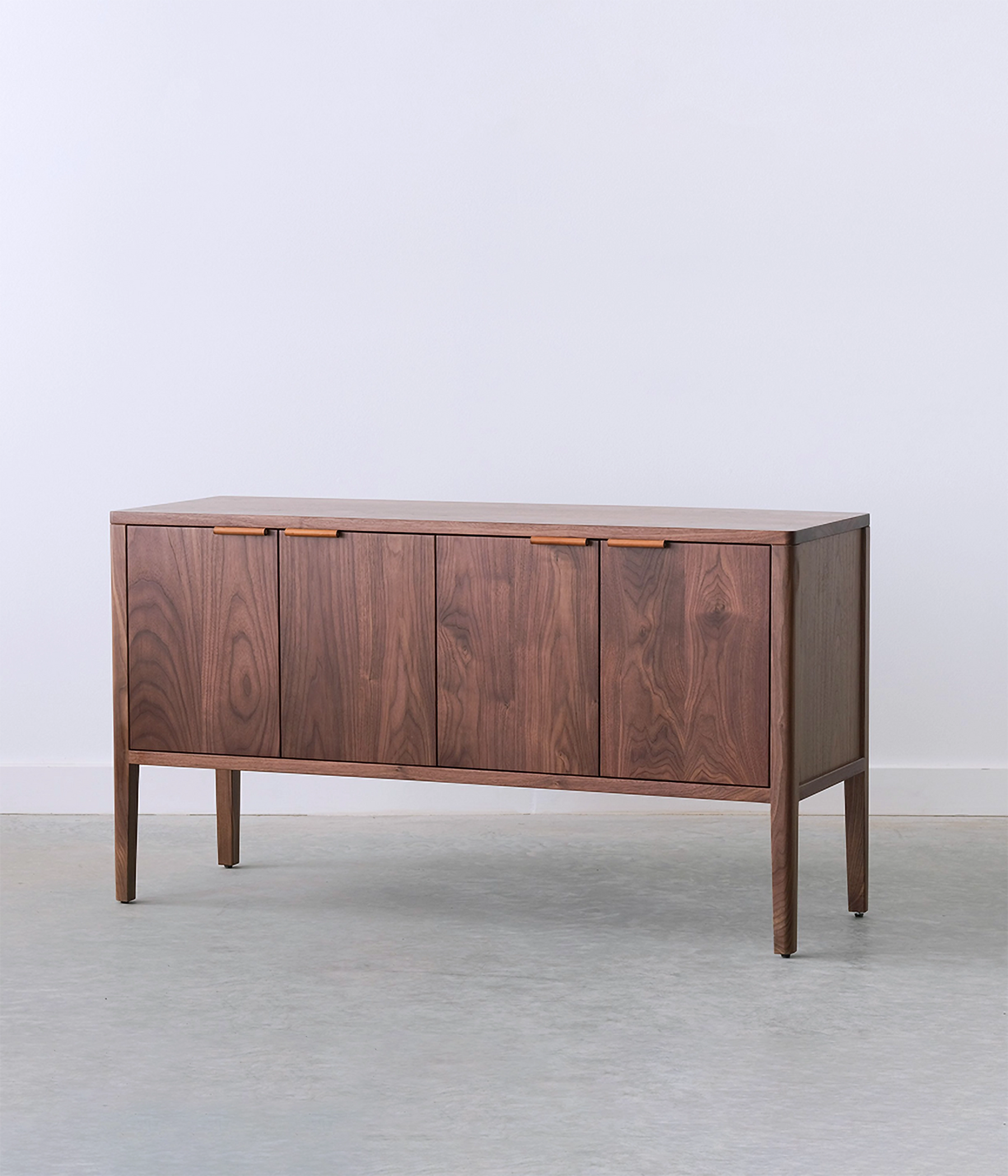 The Avers media cabinet features vertical grain doors. It's petite size lends itself to smaller spaces, but can also double as a credenza in the dining room. Custom leather pulls, designed and made in Chicago. Two adjustable shelves and cord cutouts for your media organization needs. Doors have soft close hinges.