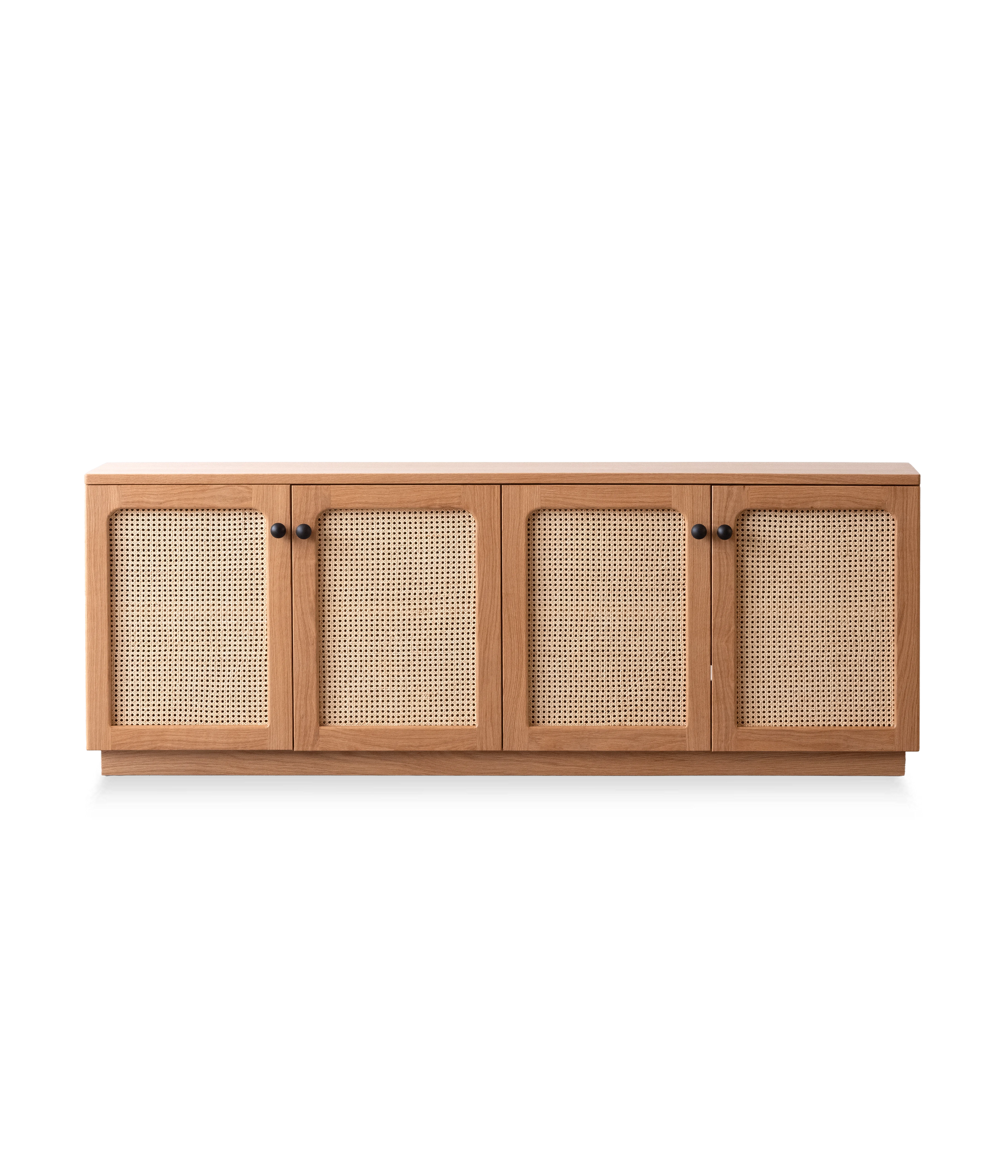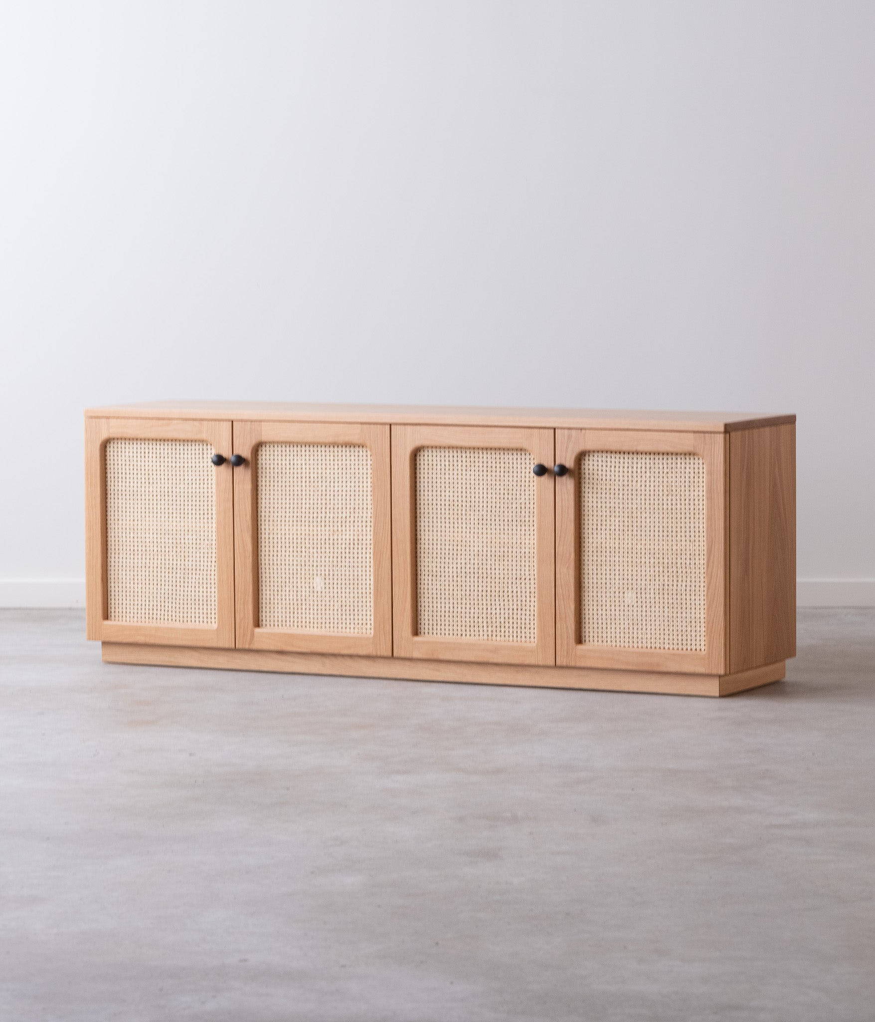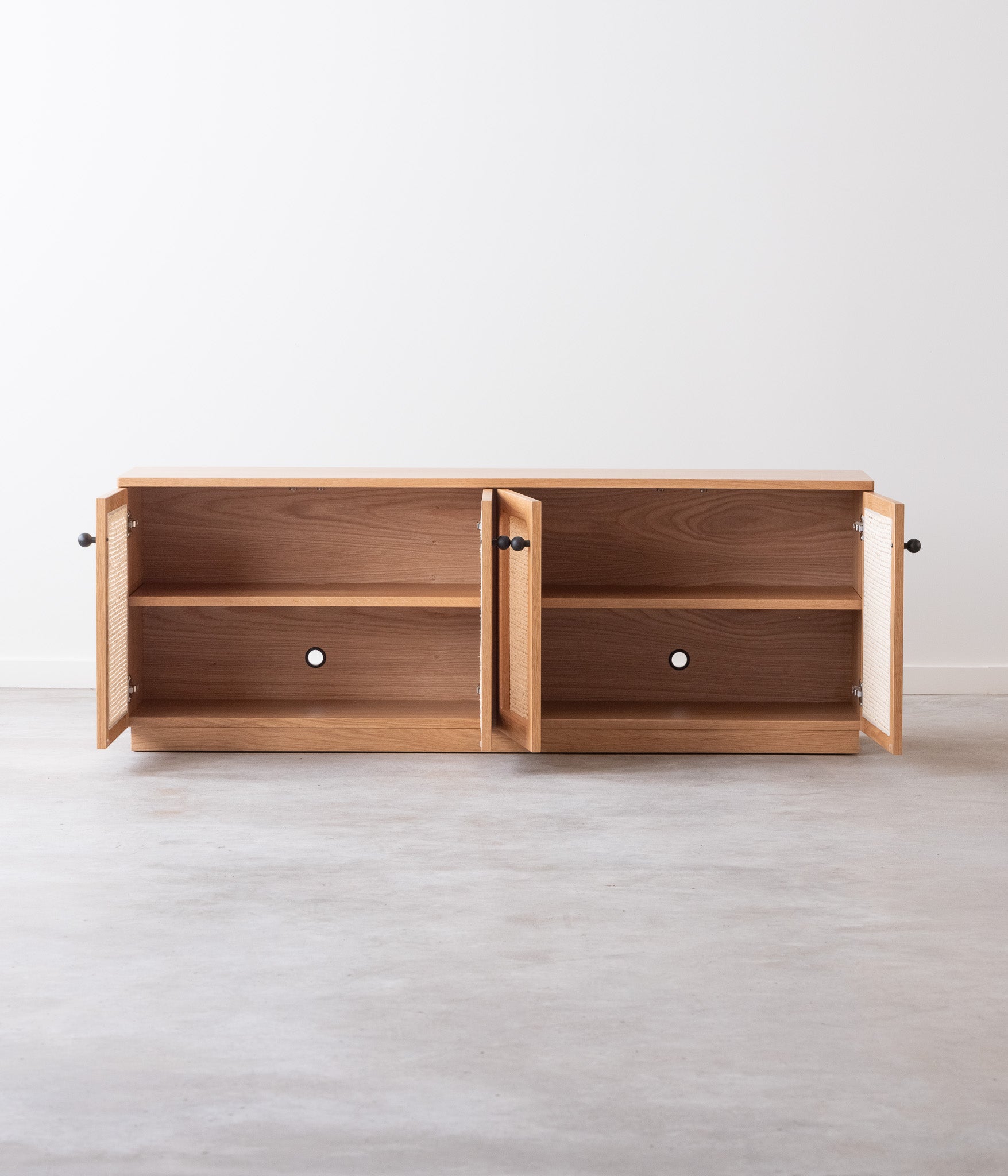The media console features four cane doors. There are two adjustable shelves and two cord cutouts in the back of the cabinet for cord management.